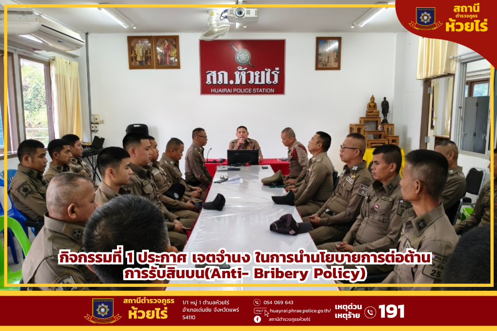 วันที่ 29 พ.ย. 2567 พ.ต.ท.วิทูร ตั้งวุฒิสาร สวญ.สภ.ห้วยไร่ จัดการประชุมข้าราชการตํารวจในสังกัด เพื่อชี้แจง และประกาศ เจตจํานง ในการนํานโยบายการต่อต้านการรับสินบน(Anti- Bribery Policy) ไปปฏิบัติ เพื่อให้ทุกคนทราบและปฏิบัติ โดยชี้แจงให้เข้าถึง การไม่รับของขวัญ ของกํานัล ตามประกาศของสถานี เป็นสิ่งที่ต้องปฏิบัติตามประกาศโดยทุกคนทราบเเละ ตั้งมั่นปฏิบัติให้เกิดเป็นรูปธรรมและเป็นที่ประจักษ์ของสาธารณะชนโดยให้จัดทําประกาศติดไว้ที่จุดบริการประชาชนเพื่อให้ทราบโดยทั่วกัน