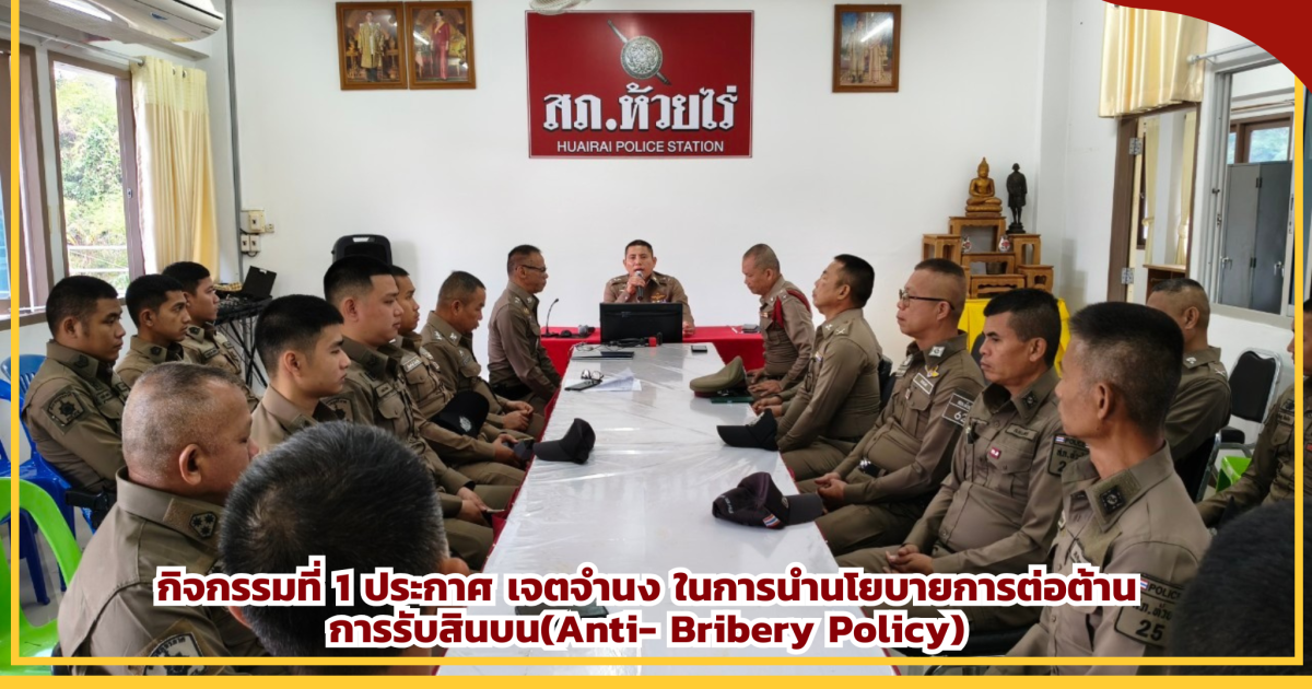 วันที่ 29 พ.ย. 2567 พ.ต.ท.วิทูร ตั้งวุฒิสาร สวญ.สภ.ห้วยไร่ จัดการประชุมข้าราชการตํารวจในสังกัด เพื่อชี้แจง และประกาศ เจตจํานง ในการนํานโยบายการต่อต้านการรับสินบน(Anti- Bribery Policy) ไปปฏิบัติ เพื่อให้ทุกคนทราบและปฏิบัติ โดยชี้แจงให้เข้าถึง การไม่รับของขวัญ ของกํานัล ตามประกาศของสถานี เป็นสิ่งที่ต้องปฏิบัติตามประกาศโดยทุกคนทราบเเละ ตั้งมั่นปฏิบัติให้เกิดเป็นรูปธรรมและเป็นที่ประจักษ์ของสาธารณะชนโดยให้จัดทําประกาศติดไว้ที่จุดบริการประชาชนเพื่อให้ทราบโดยทั่วกัน