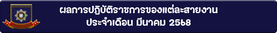 ผลการปฏิบัติราชการของแต่ละสายงานประจำเดือน มีนาคม 2568 23 มีนาคม 2568 โดย admin / ข่าวประชาสัมพันธ์,ข่าวกิจกรรม รายงานผลการปฏิบัติราชการ งาน ป. ประจําเดือน มีนาคม 2568 รายงานผลการปฏิบัติราชการ งาน อก. ประจําเดือน มีนาคม 2568 รายงานผลการปฏิบัติราชการ งาน จร. ประจําเดือน มีนาคม 2568 รายงานผลการปฏิบัติราชการ งาน สืบสวน ประจําเดือน มีนาคม 2568 รายงานผลการปฏิบัติราชการ งาน สอบสวน ประจําเดือน มีนาคม 2568