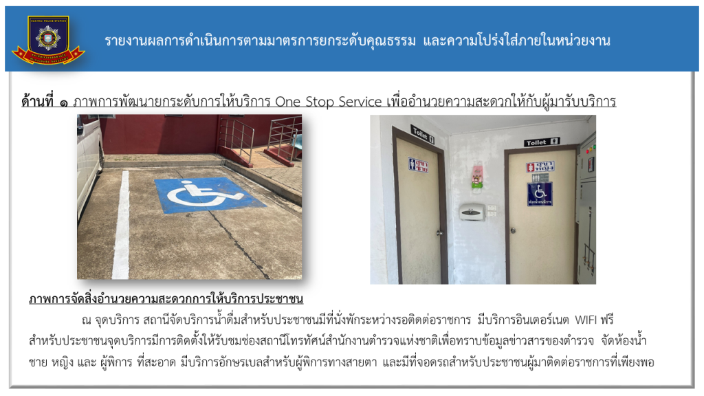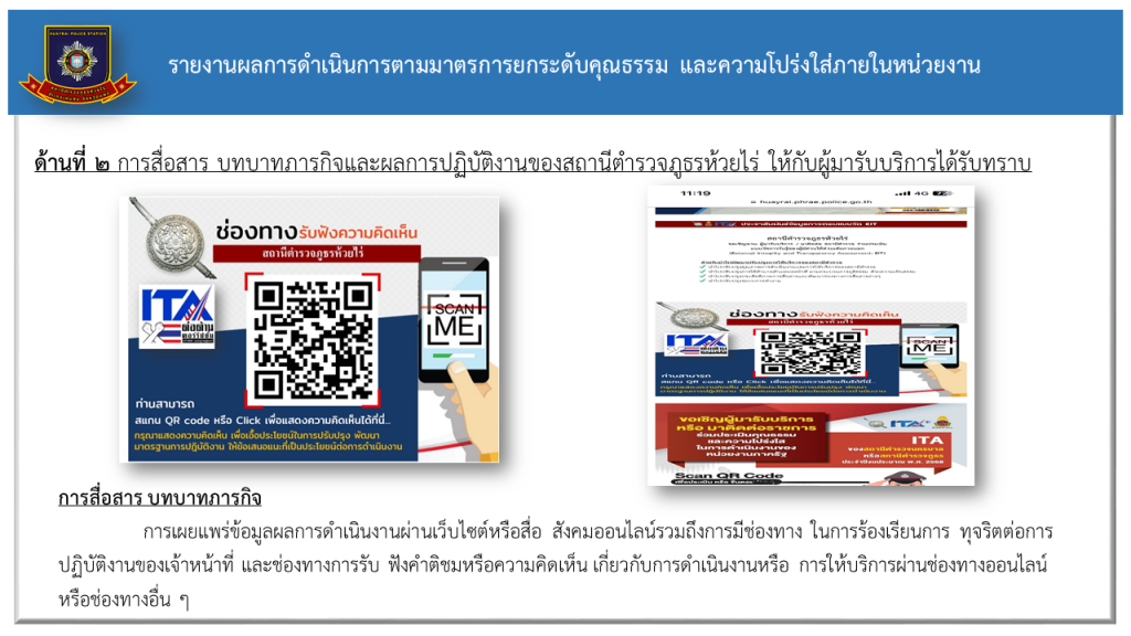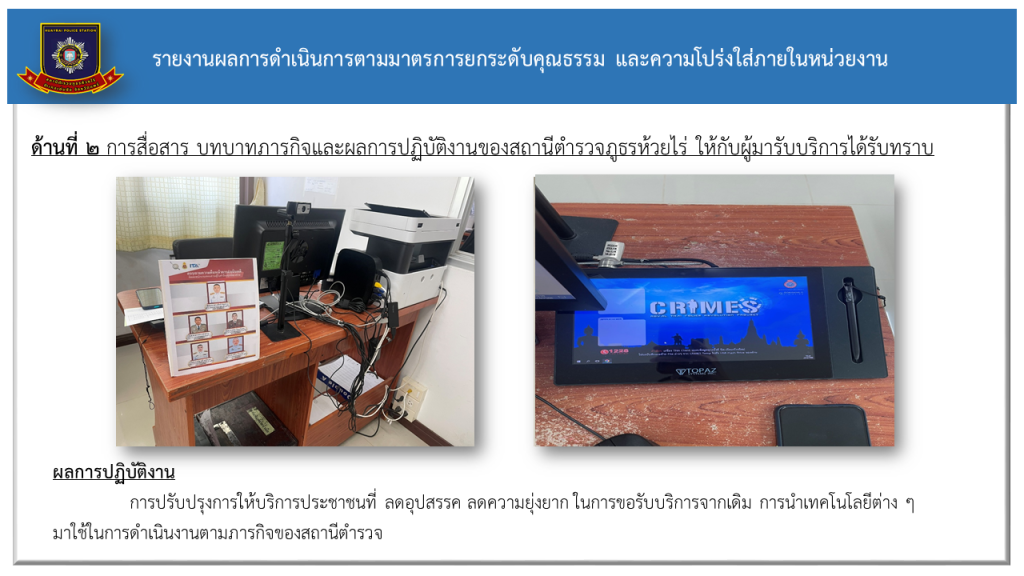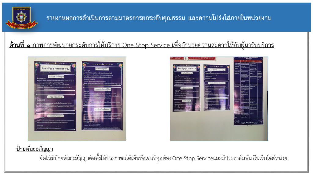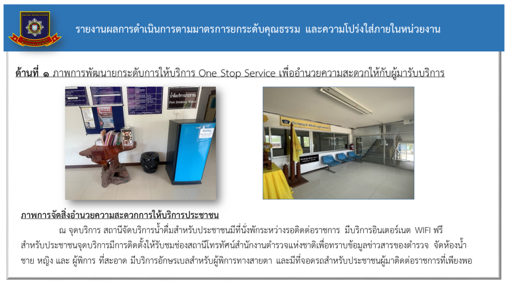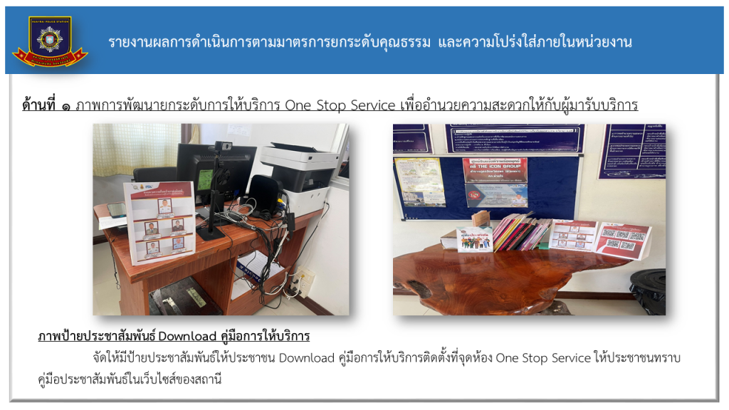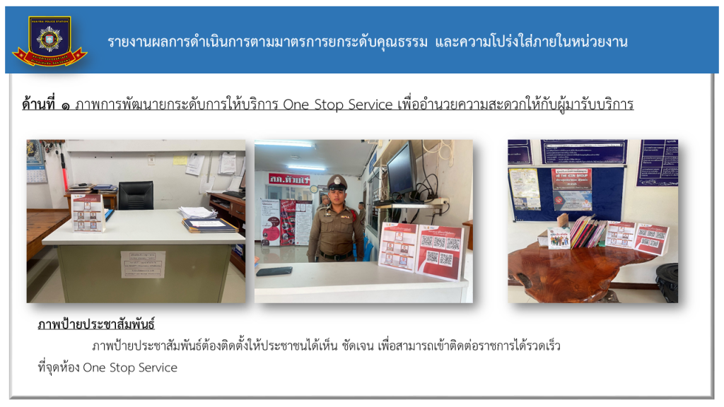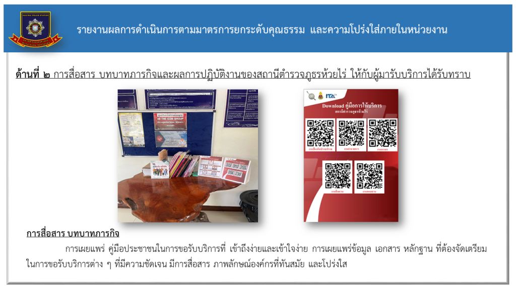 - 2) ภาพประชาสัมพันธ์การสื่อสาร บทบาทภารกิจ และผลการปฏิบัติงานของสถานีตำรวจนครบาลและสถานีตำรวจภูธรให้กับประชาชนที่มารับบริการได้รับทราบ