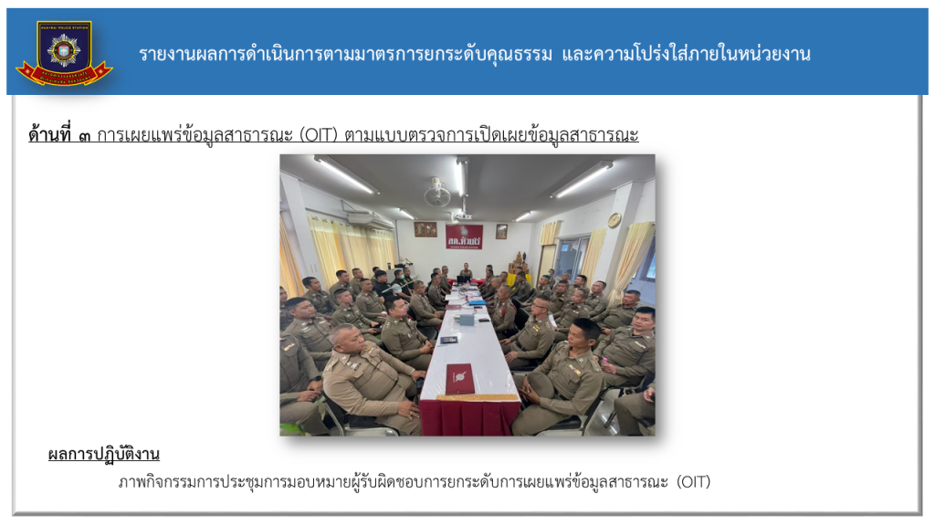 - 3) ภาพกิจกรรมหรือรายงานการประชุมการมอบหมายผู้รับผิดชอบการยกระดับการเผยแพร่ข้อมูลสาธารณะ (OIT)