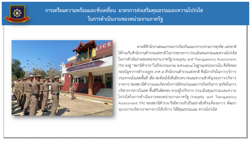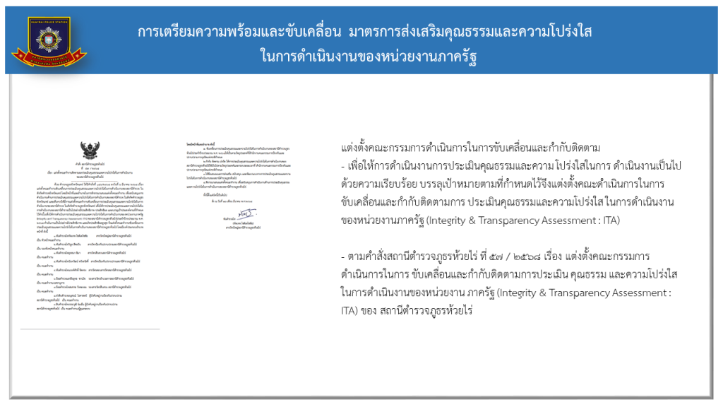 - กิจกรรมหรือการดำเนินการที่สอดคล้องกับมาตรการยกระดับคุณธรรมและความโปร่งใสภายในหน่วยงานตามข้อ O24 ที่สถานีตำรวจได้ดำเนินการ ดังนี้