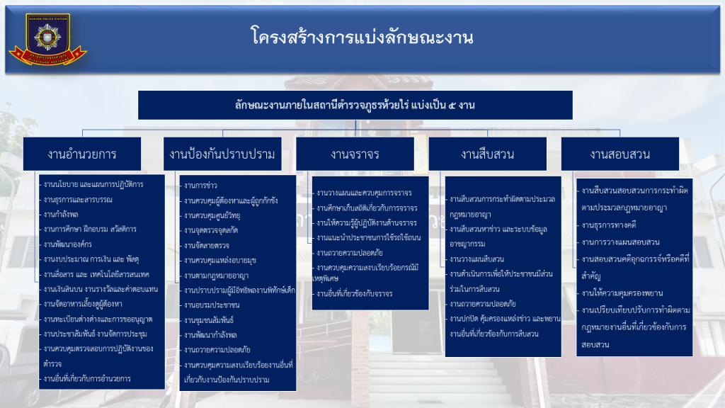 - ข้อมูลเกี่ยวกับอำนาจหน้าที่หรือภารกิจของสถานีตำรวจ และบทบาทภารกิจความรับผิดชอบของแต่ละสายงานภายในสถานีตำรวจ