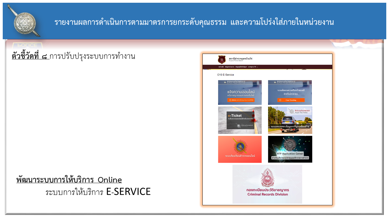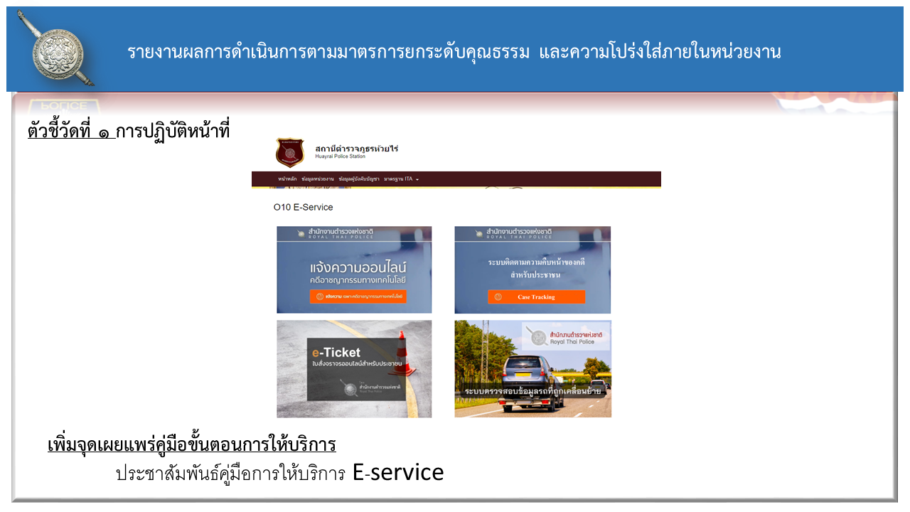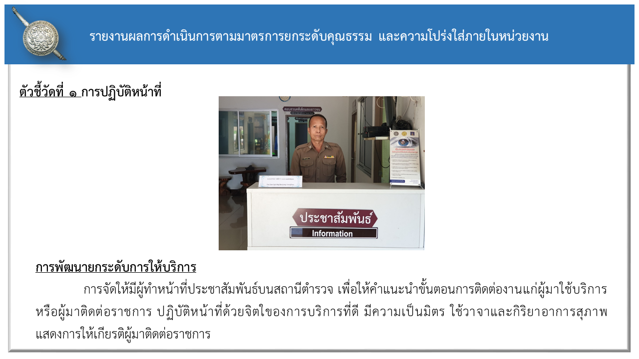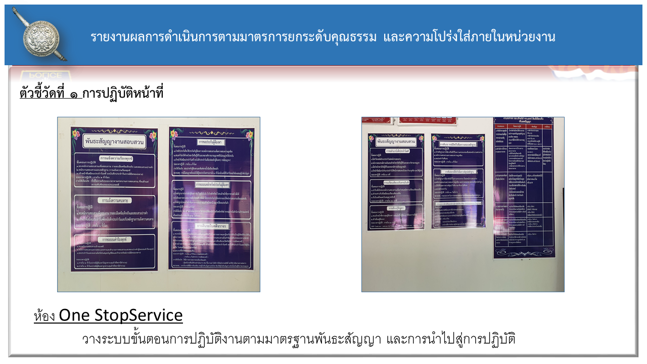 ผลการดำเนินการตามมาตรการการยกระดับคุณธรรมและความโปร่งใสภายในหน่วยงาน/One Stop Service